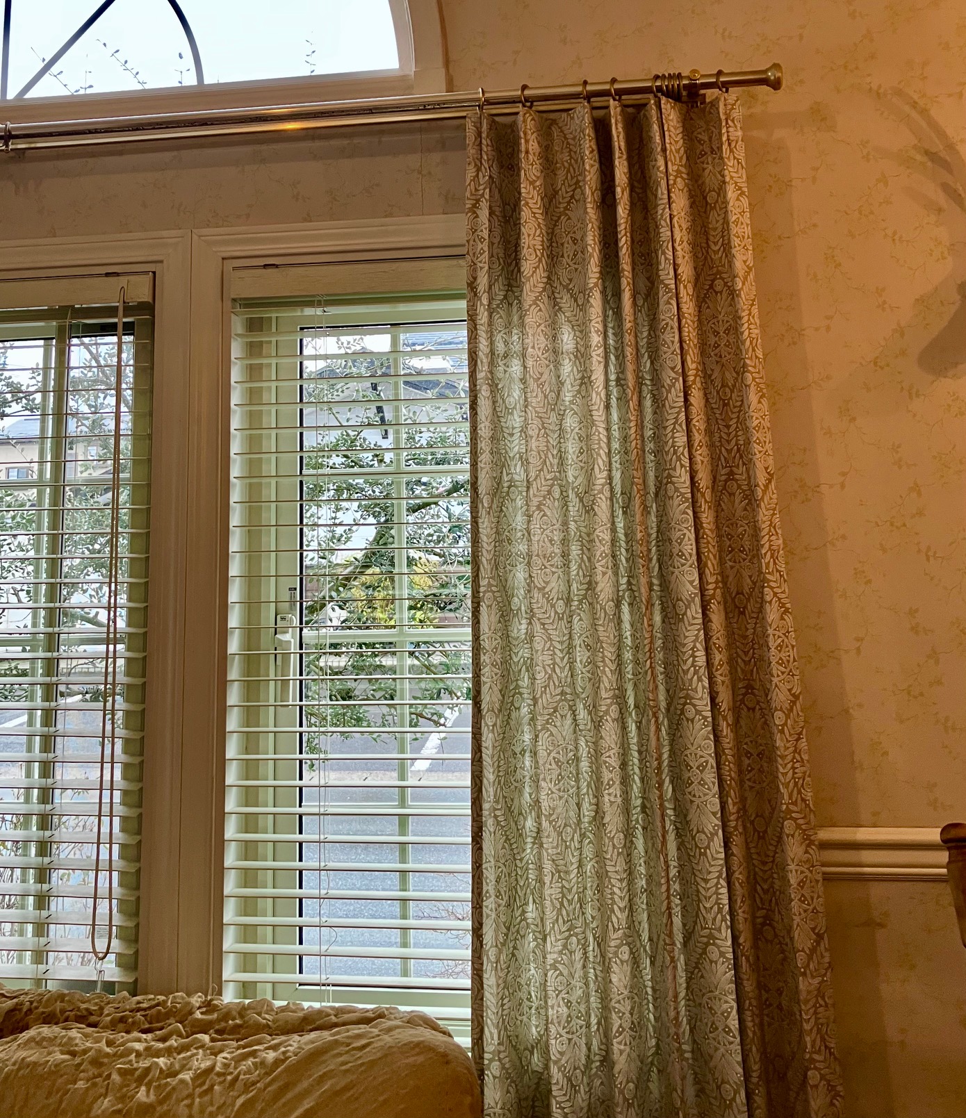 アイボリーのウッドブラインド手前のドレープカーテンは開閉はせずにあくまで窓の左右に装飾としてのカーテンです。